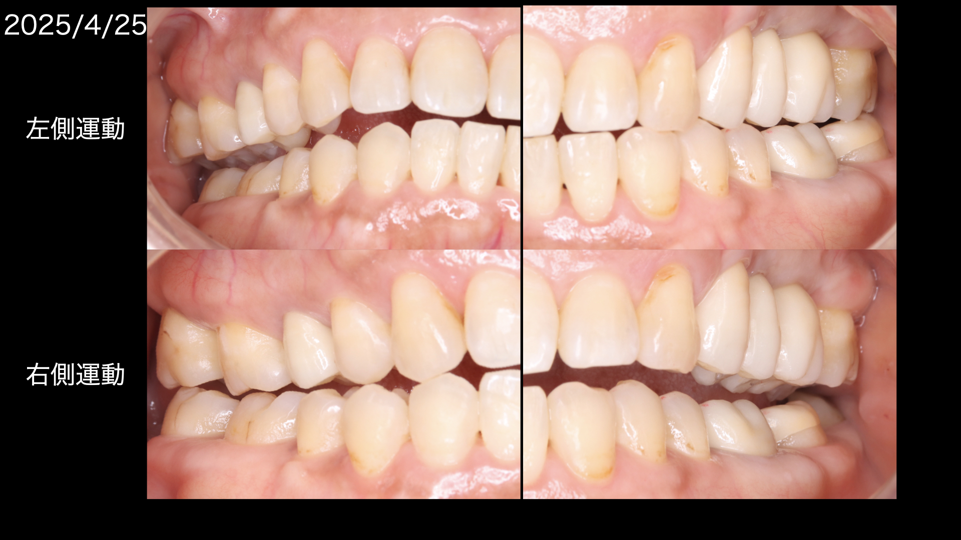 このように左側運動では左の犬歯(糸切り歯)だけが当たって、右側はあたらないように(離開:ディスクルージョン)