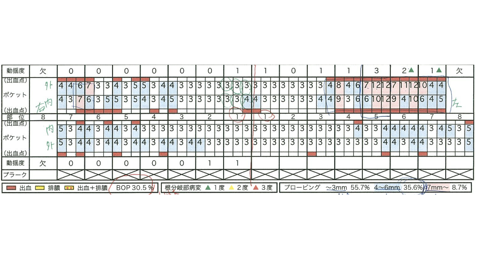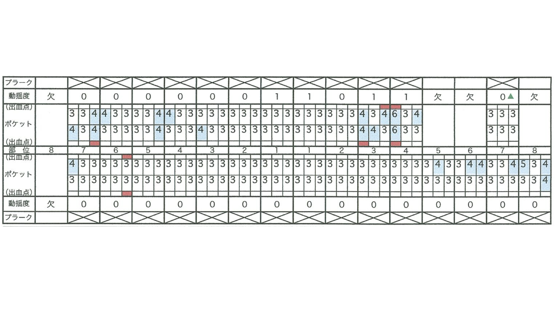歯周病の検査です。やや全体的に歯周病が進んでいますが、特に左上の部分は顕著にすすんでいます。