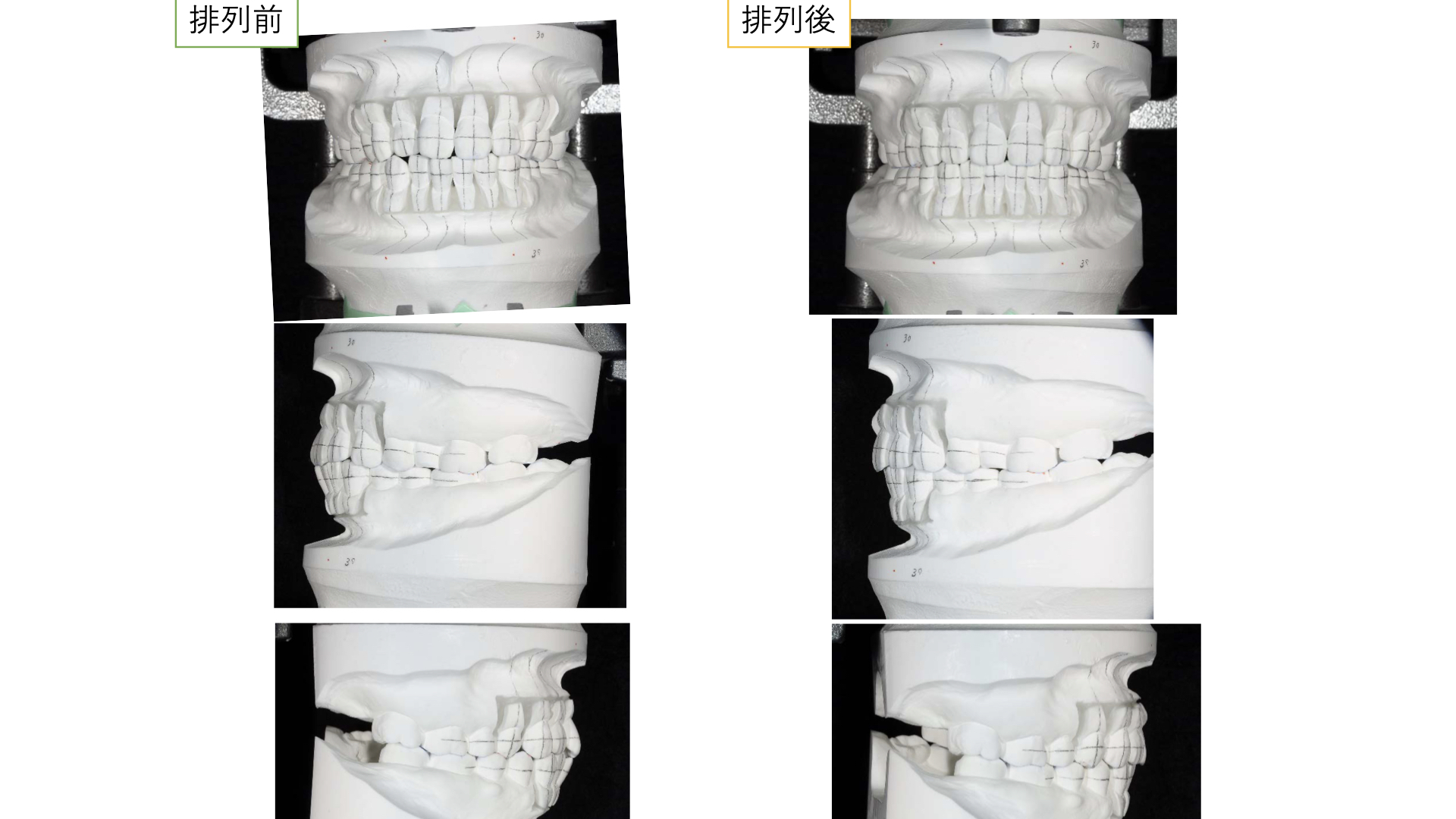 模型上で、そこから歯を並べて(排列)みて奥歯をさわらずに短い期間で矯正治療ができるのかをシミュレーションした結果