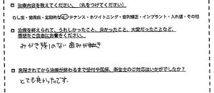 ◆治療内容定期的なメンテナンス ◆治療後の感想みがき残しのない歯みがき ◆受付や医師・衛生士の対応は?とても良かったです。