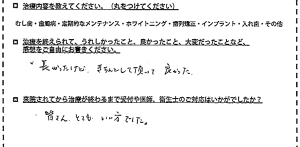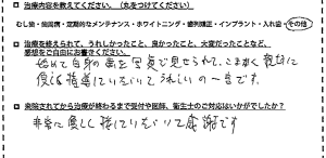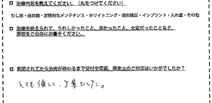 ◆治療内容その他(出血したため) ◆治療後の感想初めて自身の歯を写真で見せられて、細かく親切に優しく指導して頂いて、うれしいの一言です。 ◆受付や医師・衛生士の対応は?非常に優しく接していただいて感謝です。