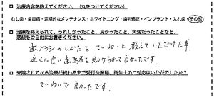 その他の治療◆治療内容その他の治療◆治療後の感想話を聞いていただいた上ででのアドバイスなどをしていただいて良かった。痛いと聞いていたが、対応もしっかりしていてすごく良かった。◆受付や医師・衛生士の対応は?すごく良かったです。貴院を友人にも紹介していきた...