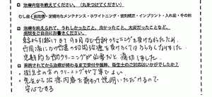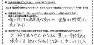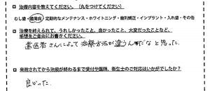 ◆治療内容歯周病 ◆治療後の感想歯に対しての注意度が変わった、歯みがきの時間が長くなった。 ◆受付や医師・衛生士の対応は?少し不安で来たけど、みなさん優しく予約変更の場合でも快く対応して頂いてホッとしました。