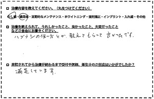 ◆治療内容むし歯・歯周病・定期的なメンテナンス・入れ歯 ◆治療後の感想磨き方が良く分かった事 ◆受付や医師・衛生士の対応は?