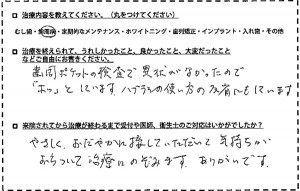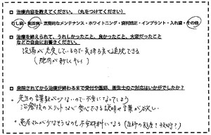 ◆治療内容歯周病 ◆治療後の感想歯周ポケットの検査で異状がなかったので「ホッ」としています。歯ブラシの使い方の反省もしています。 ◆受付や医師・衛生士の対応は?やさしくおだやかに接していただいて気持ちが落ち着...